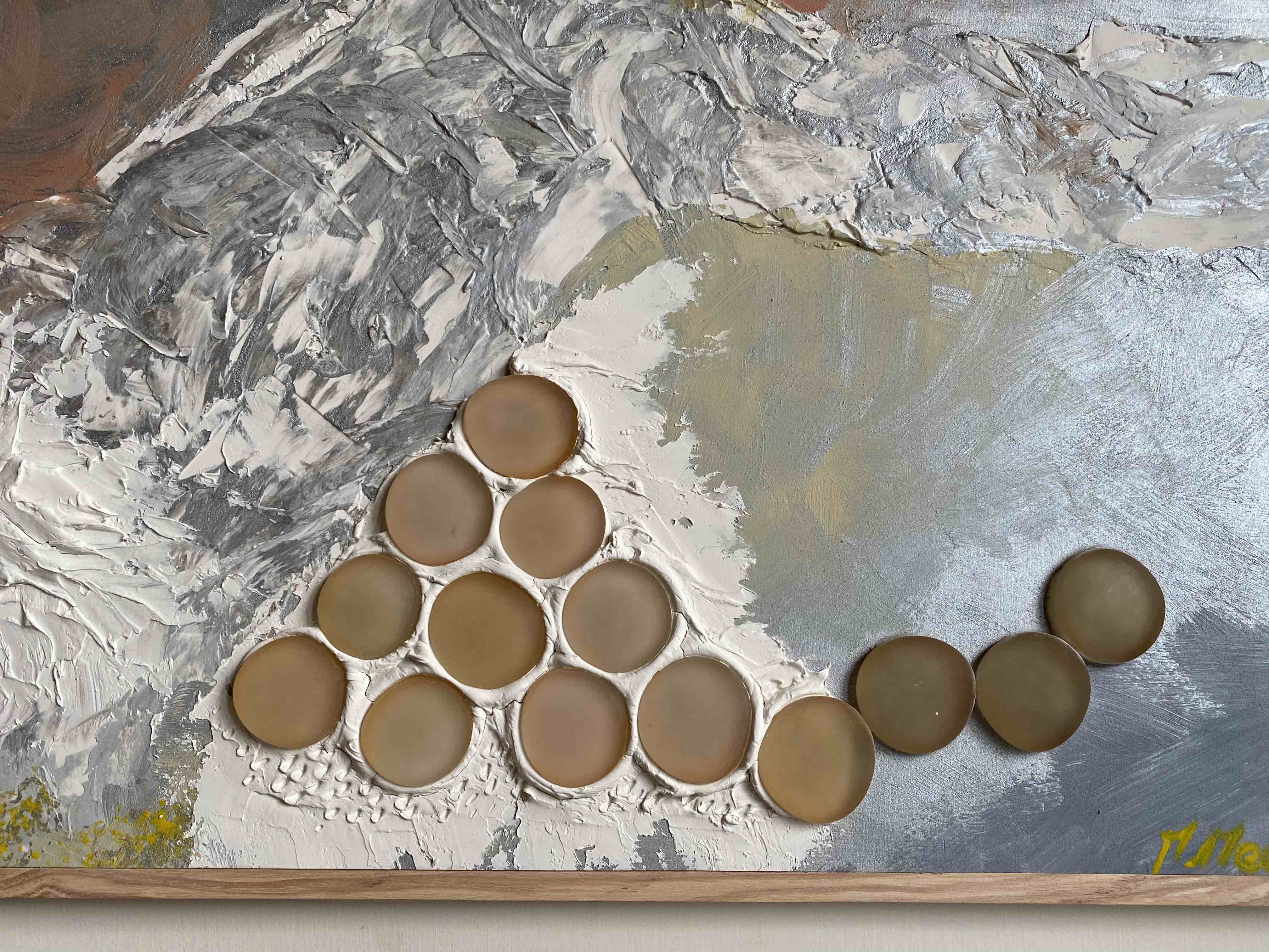 Hand decorated wooden panel with mixed technique. Finish in ash cylinders in cherry.