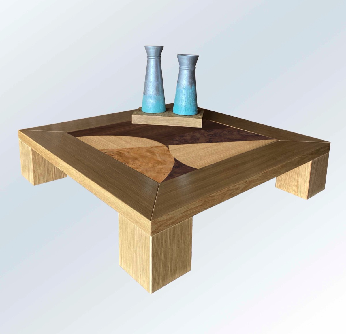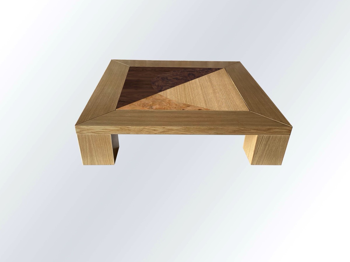 The tables are part of a collection of 6 elements, all with central inlay inspired by the furniture of the Monasteries with manual creation using artisanal techniques handed down over time. The central inlaid part features various wood essences and the frames with legs are in oak. The design with the various essences is enriched by colors and geometric and non-geometric designs which also recall the modern style of the mid-20th century and in general the Italian design of the 20th century. Each piece is unique, signed, a beautiful collectible piece of furniture.