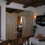 The restored farmhouse with typical materials is characterized by a large portico that overlooks the terrace on the green park and an original entrance with wooden beam. The interior architecture is a synthesis of modern and traditional. The large space of the ground floor with kitchen, dining area, living room and study is connected to the upstairs fireplace area with a double volume that allows a glimpse of the roof. The sleeping area is accessed from a central staircase with masonry surfaces treated with encaustic.